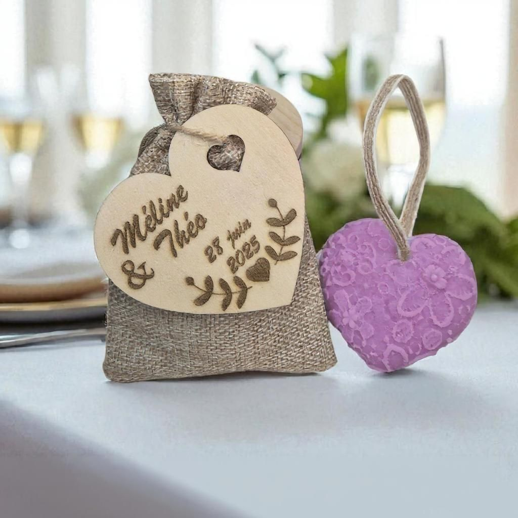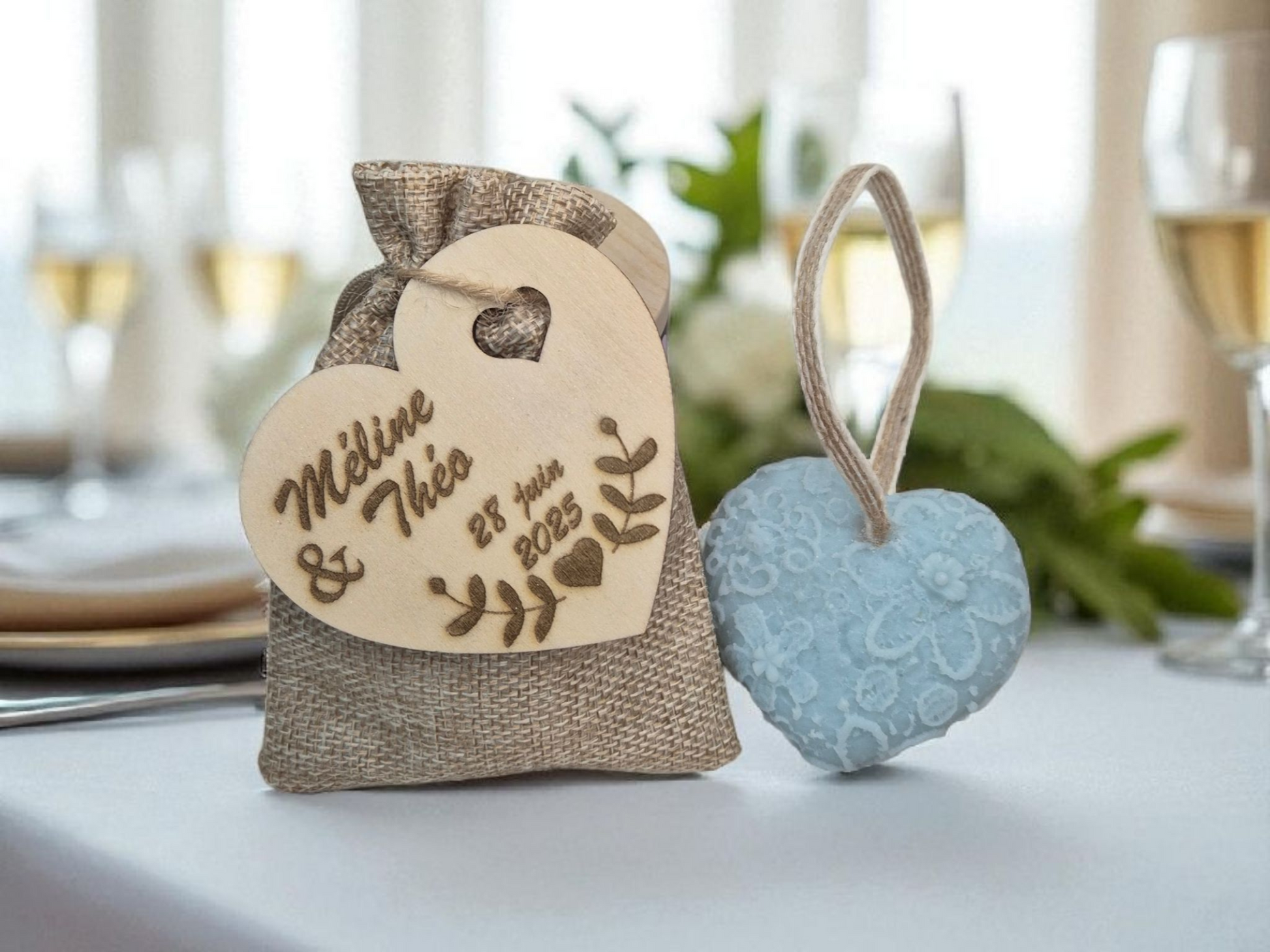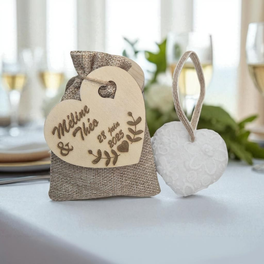 This pretty linen-effect fabric pouch contains a heart-shaped scented suspension, to slip into a wardrobe, a drawer or hang wherever you wish, it will diffuse a refined scent while adding a decorative touch. On the front, a charming wooden heart engraved with the name and date of your event (wedding, baptism, birthday, etc.) adds a personalized and unique touch.