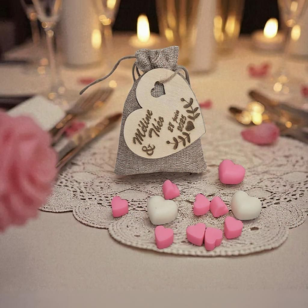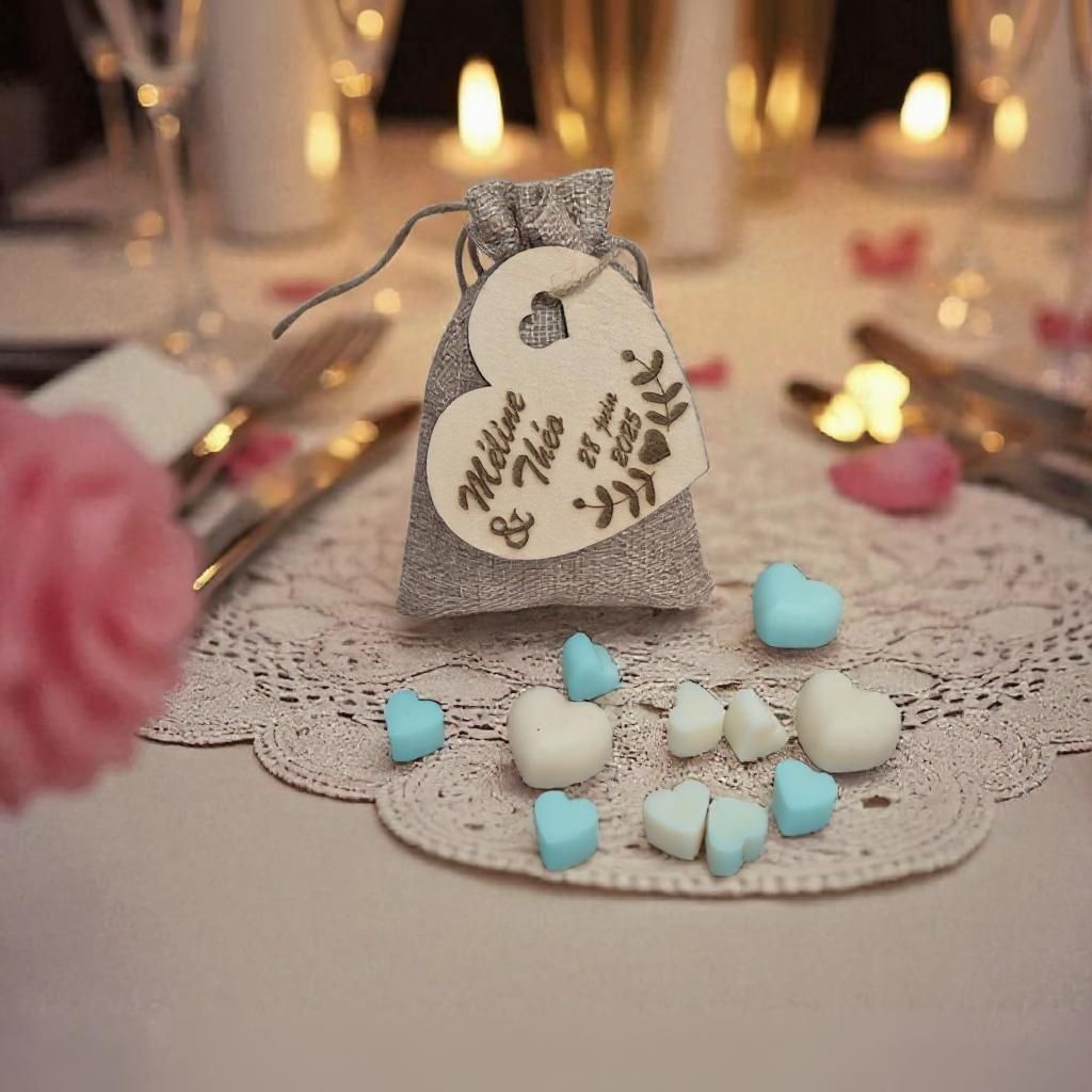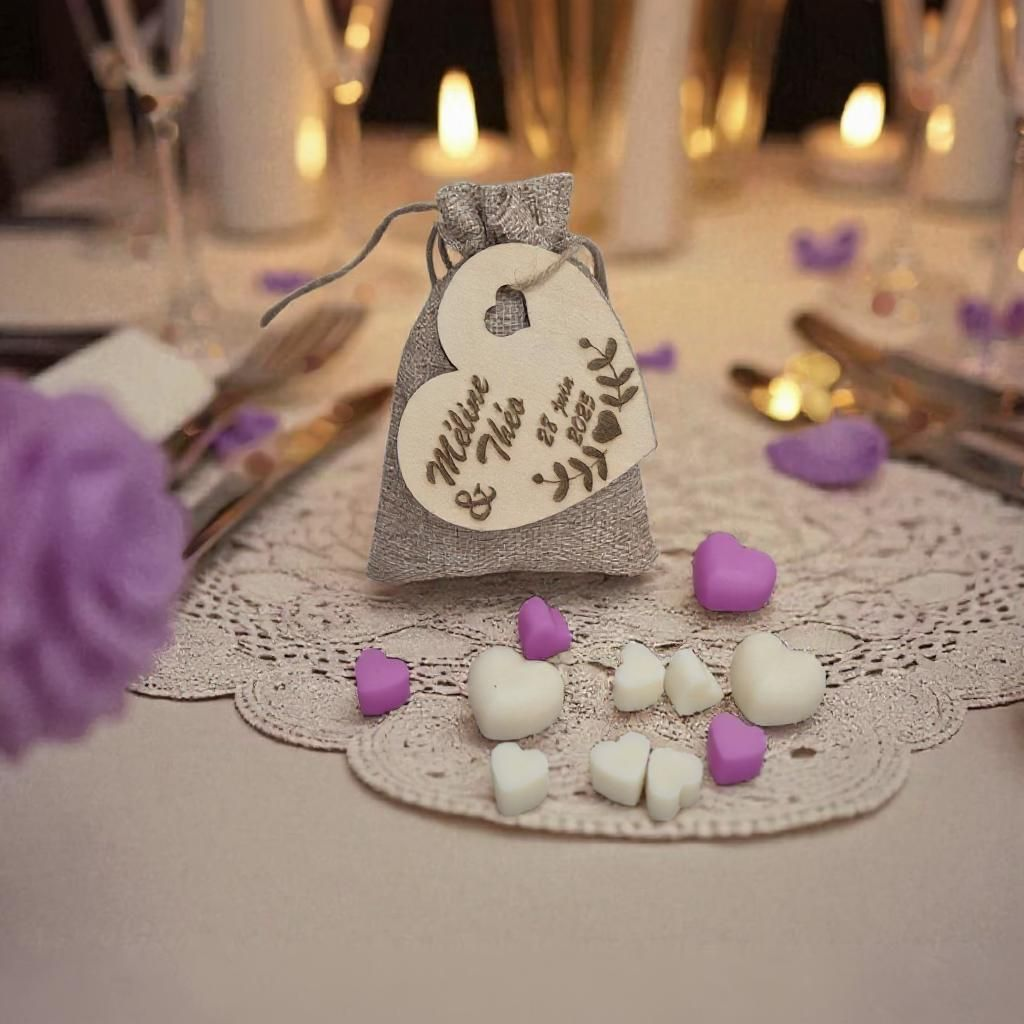 This linen-effect fabric pouch hides tender little scented fondant hearts, to be melted in a fragrance burner to diffuse a sweet fragrance. On the front, a charming wooden heart engraved with the name and date of your event (wedding, baptism, birthday, etc.) adds a personalized and unique touch. An original gift that combines elegance, fragrance, and a lasting memory.