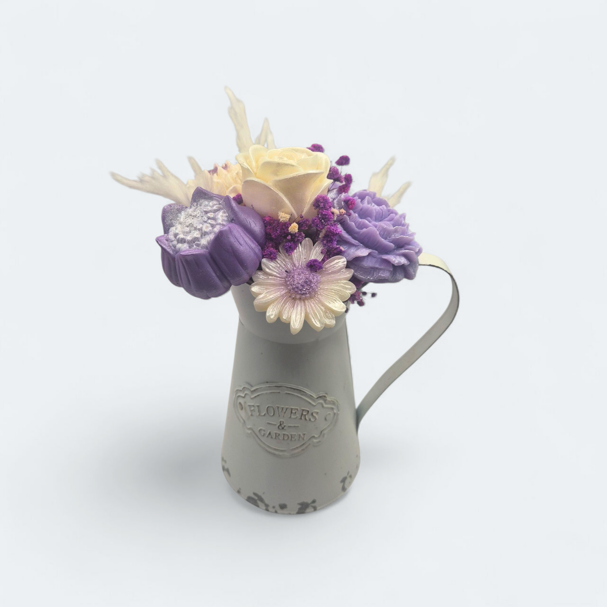 Un bouquet de fleurs éternelles en cire végétale, entièrement fait main et délicatement parfumé aux senteurs envoûtantes de Grasse. Un objet déco unique qui diffuse subtilement son parfum durant de long mois tout en embellissant votre intérieur.