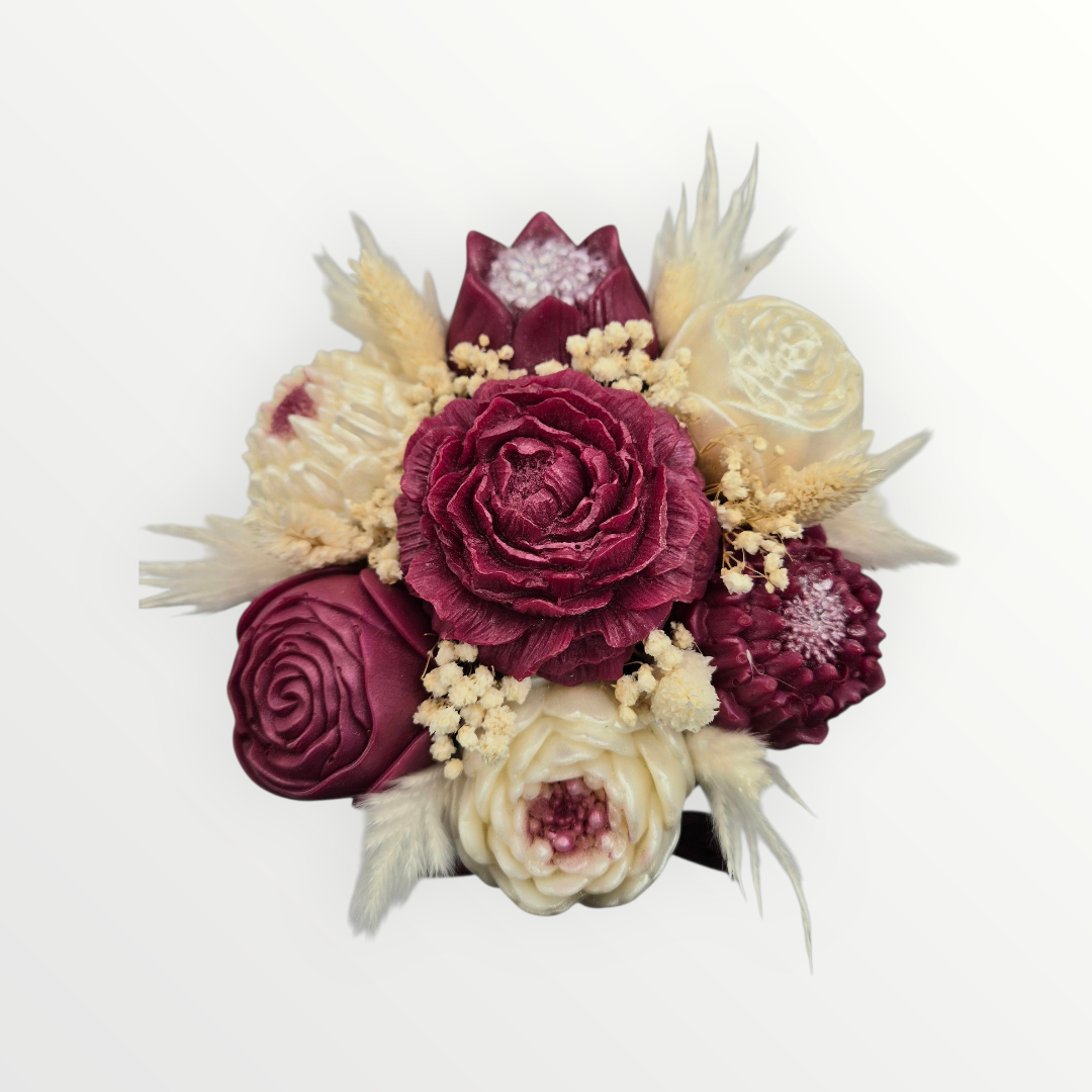 Un bouquet de fleurs éternelles en cire végétale, entièrement fait main et délicatement parfumé aux senteurs envoûtantes de Grasse. Un objet déco unique qui diffuse subtilement son parfum durant de long mois tout en embellissant votre intérieur.