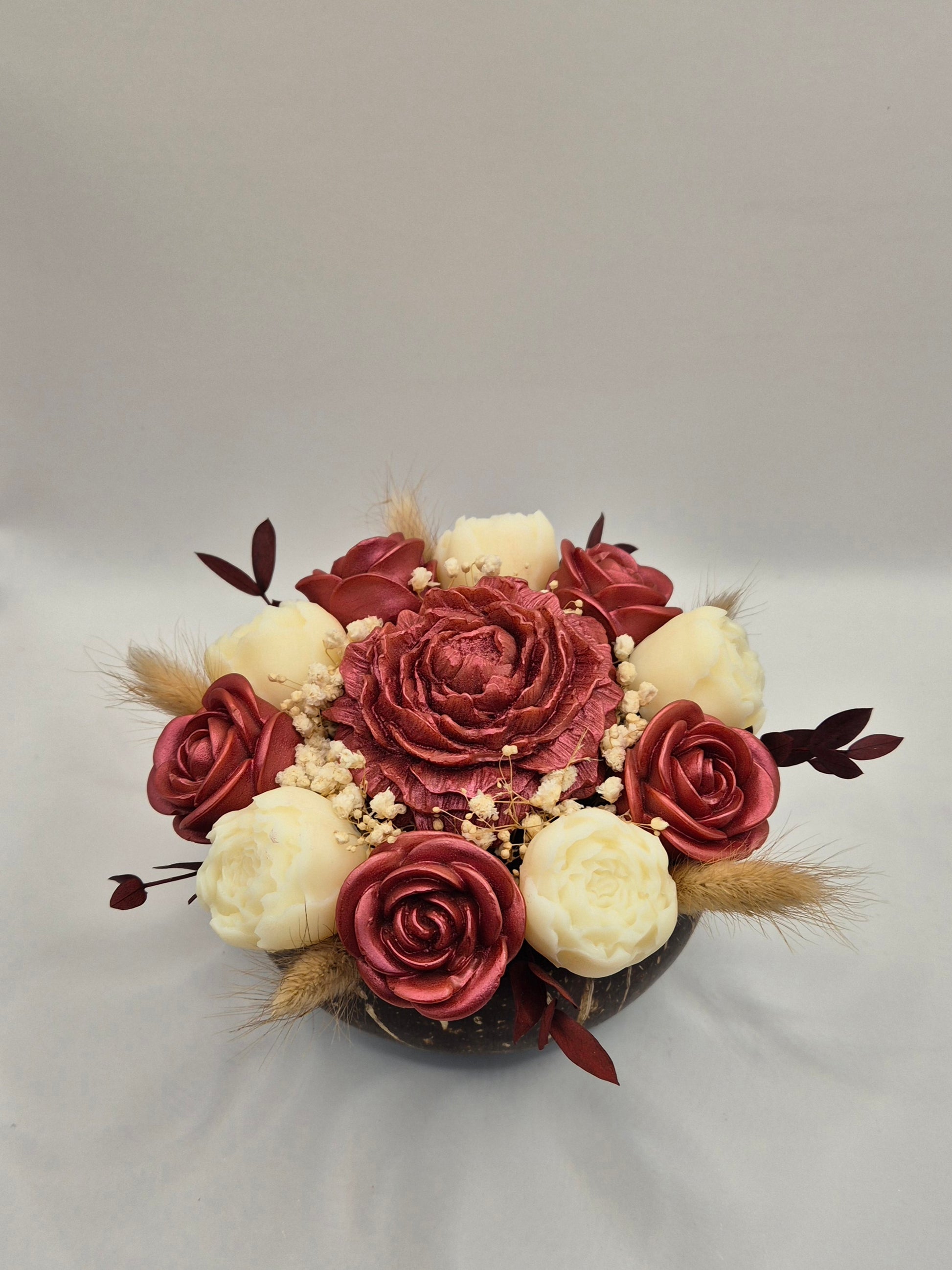 Laissez-vous séduire par cette création unique mêlant délicatement fleurs séchées et fleurs en cire parfumée, disposées dans une coque de noix de coco en bois. Chaque pièce est un petit jardin figé, une invitation au naturel, à la douceur et à la poésie.