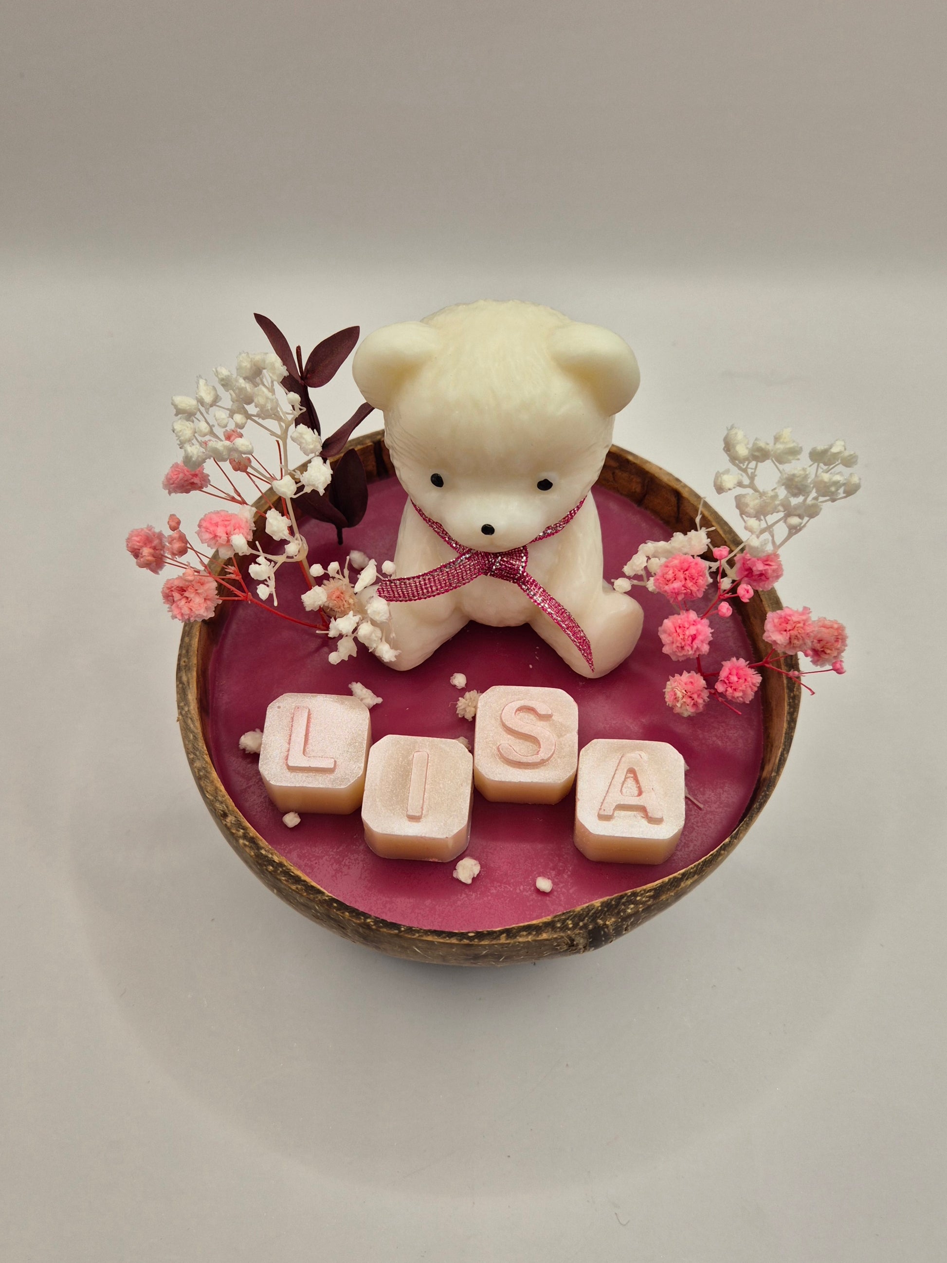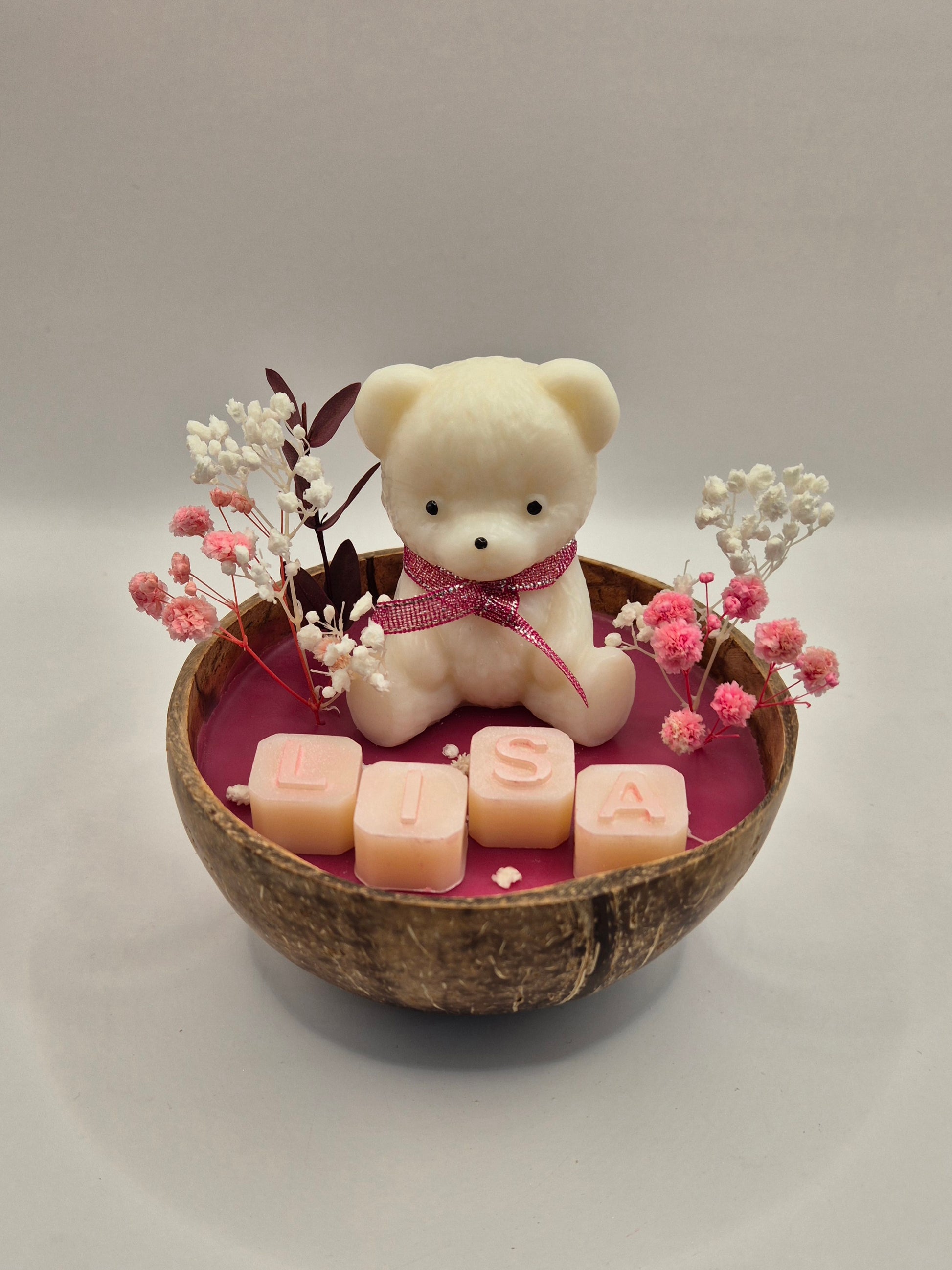 Dans une jolie coque en bois rappelant la noix de coco, découvrez une douce composition artisanale : un adorable nounours parfumé, délicatement accompagné de quelques fleurs séchées et d’un prénom personnalisé.