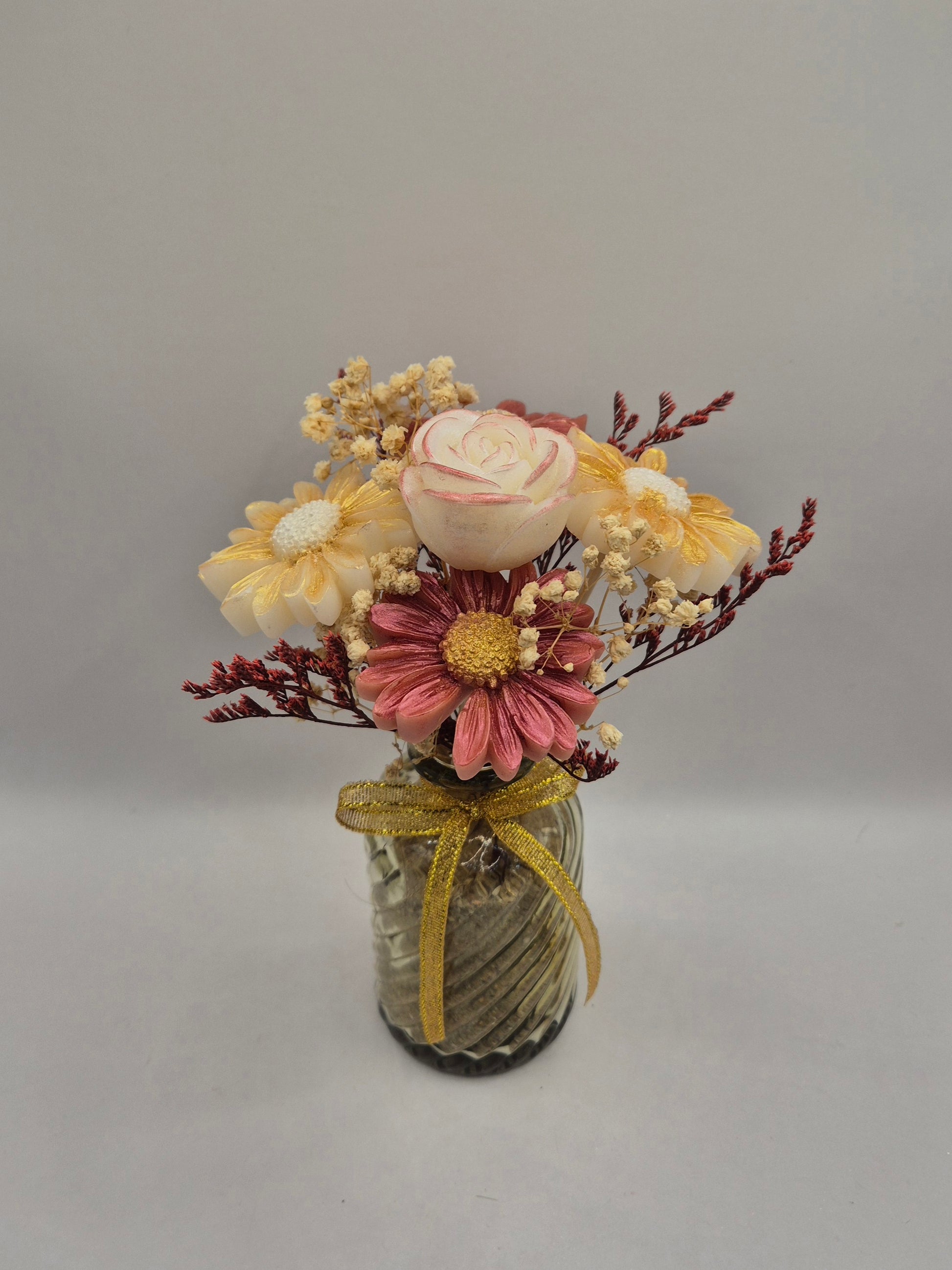 Un bouquet de fleurs éternelles en cire végétale, entièrement fait main et délicatement parfumé aux senteurs envoûtantes de Grasse. Un objet déco unique qui diffuse subtilement son parfum durant de long mois tout en embellissant votre intérieur.