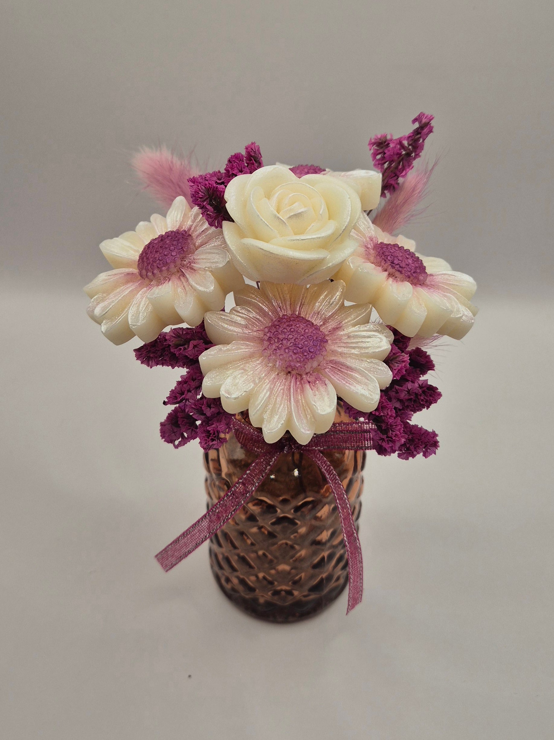 Un bouquet de fleurs éternelles en cire végétale, entièrement fait main et délicatement parfumé aux senteurs envoûtantes de Grasse. Un objet déco unique qui diffuse subtilement son parfum durant de long mois tout en embellissant votre intérieur.