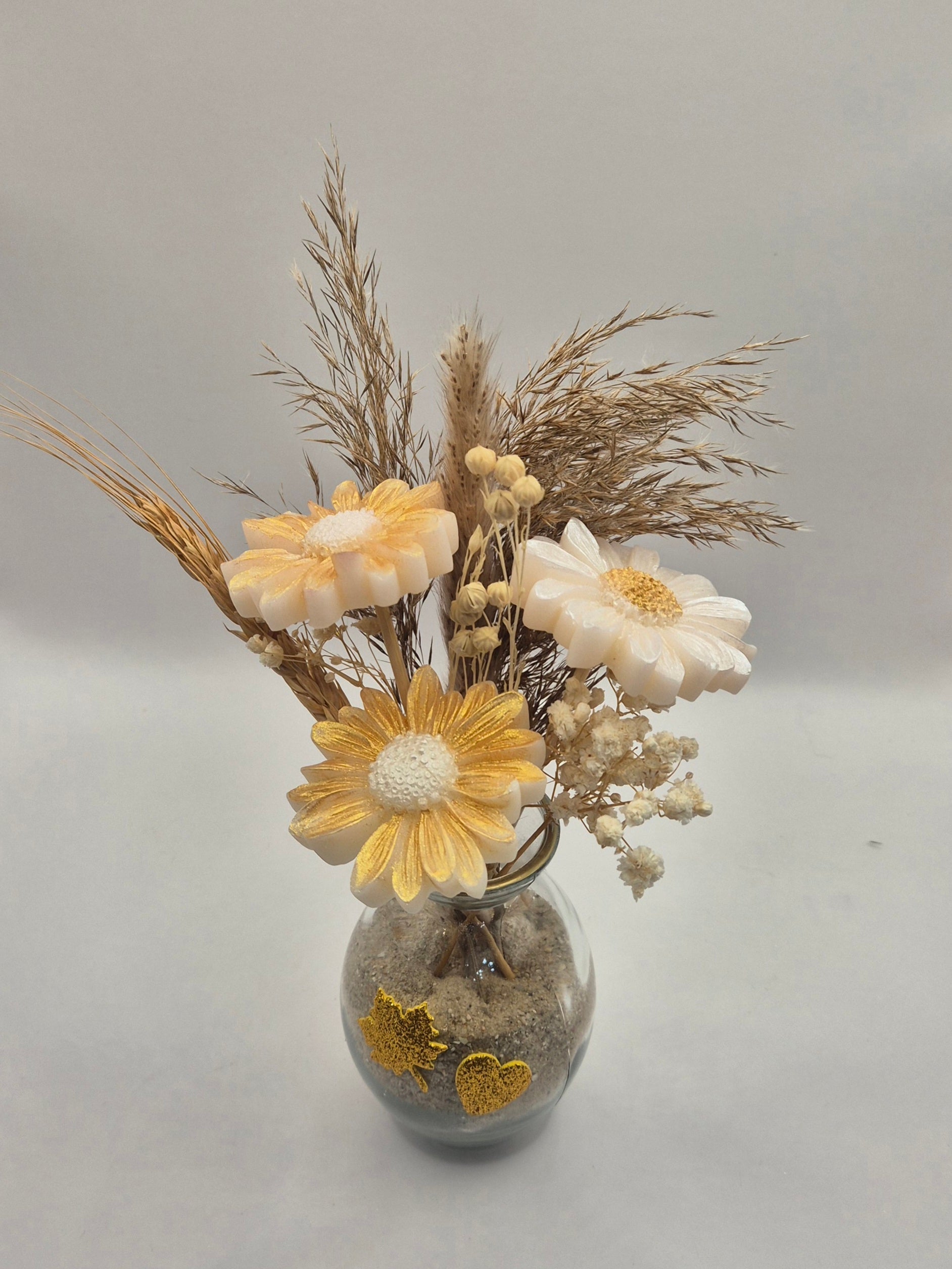 Un bouquet de fleurs éternelles en cire végétale, fleurs séchées et artificielles, entièrement fait main et délicatement parfumé aux senteurs envoûtantes de Grasse. Un objet déco unique qui diffuse subtilement son parfum durant de long mois tout en embellissant votre intérieur.