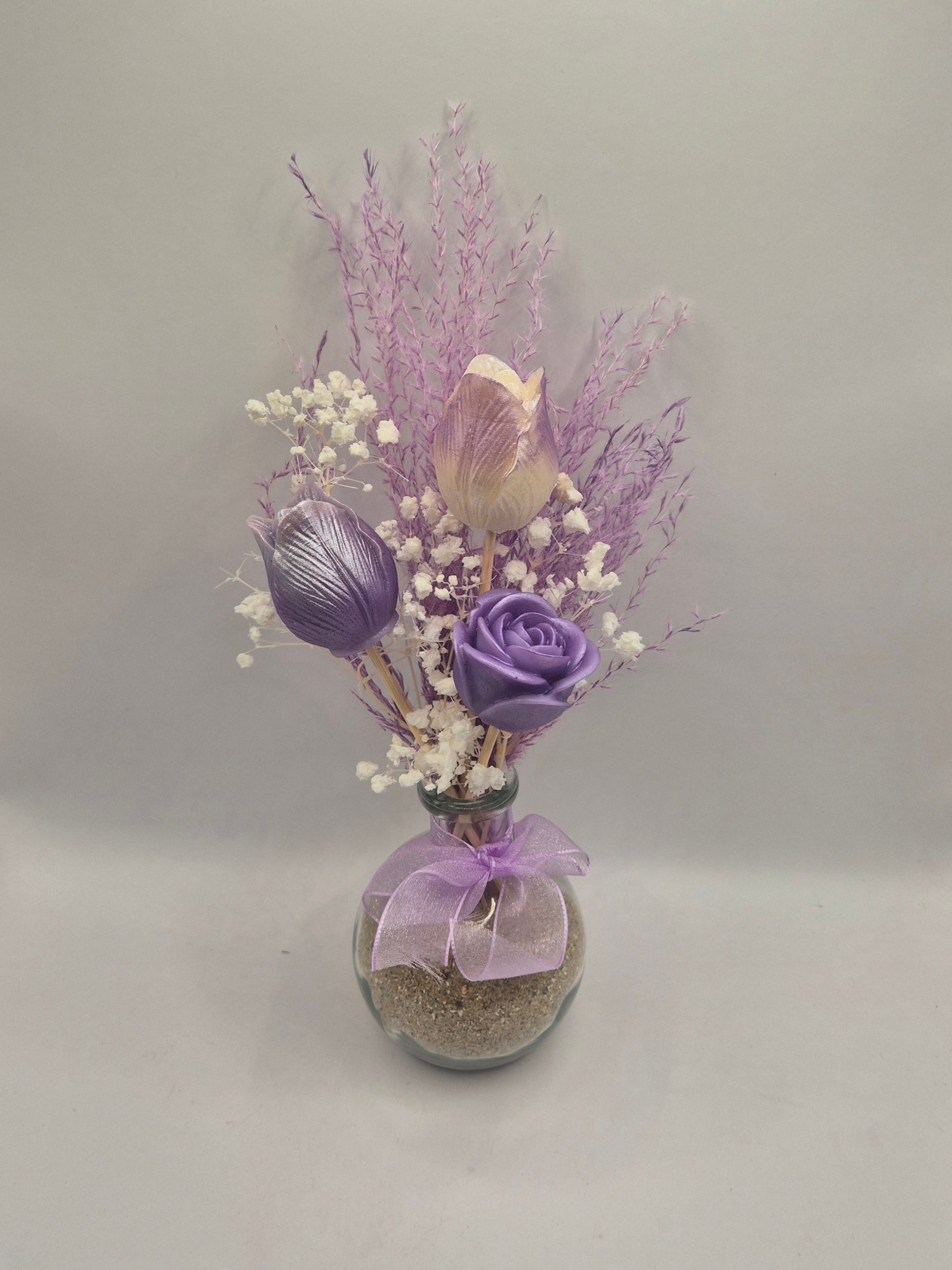 Un bouquet de fleurs éternelles en cire végétale, entièrement fait main et délicatement parfumé aux senteurs envoûtantes de Grasse. Un objet déco unique qui diffuse subtilement son parfum durant de long mois tout en embellissant votre intérieur.