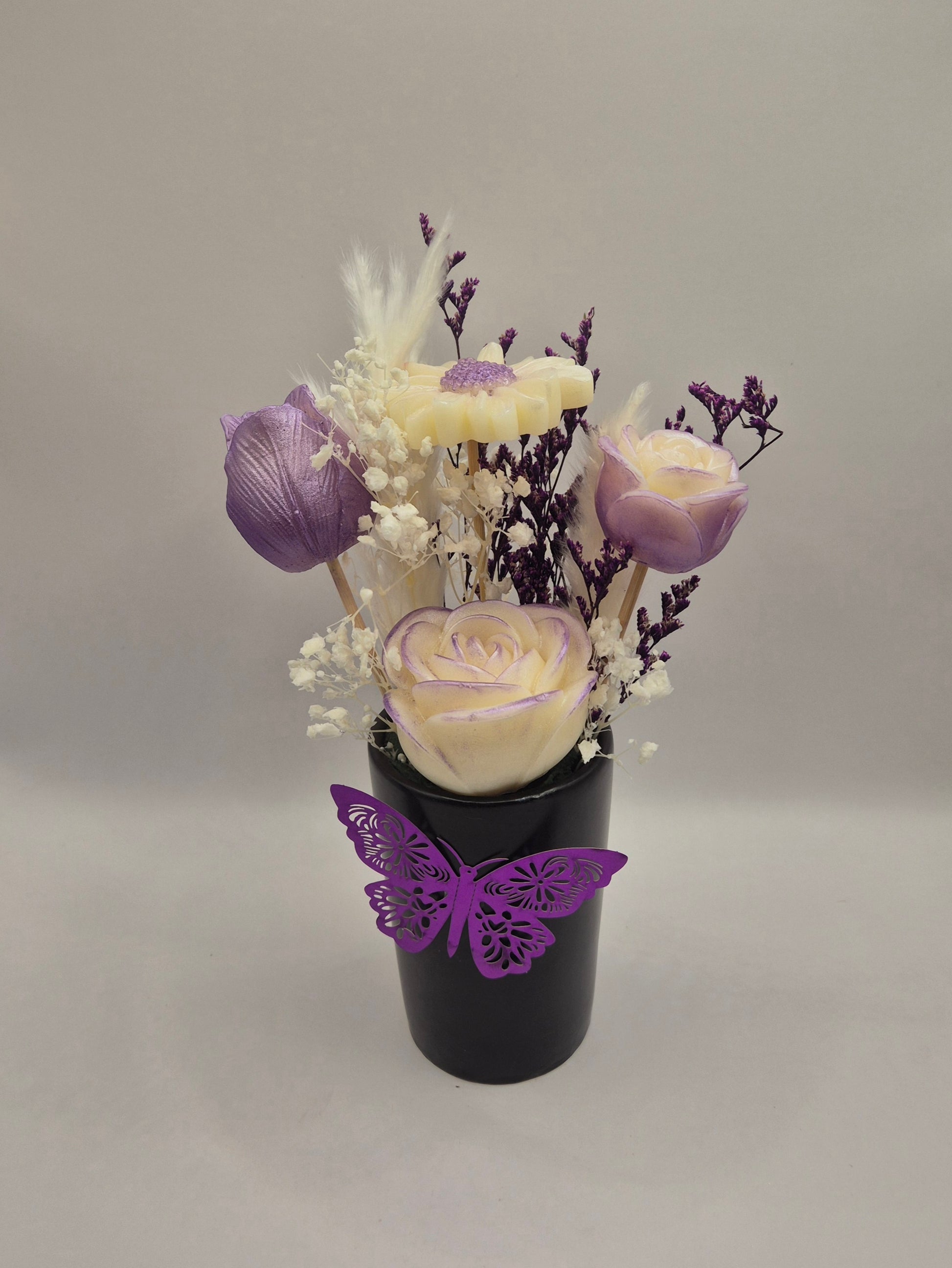Un bouquet de fleurs éternelles en cire végétale, entièrement fait main et délicatement parfumé aux senteurs envoûtantes de Grasse. Un objet déco unique qui diffuse subtilement son parfum durant de long mois tout en embellissant votre intérieur.