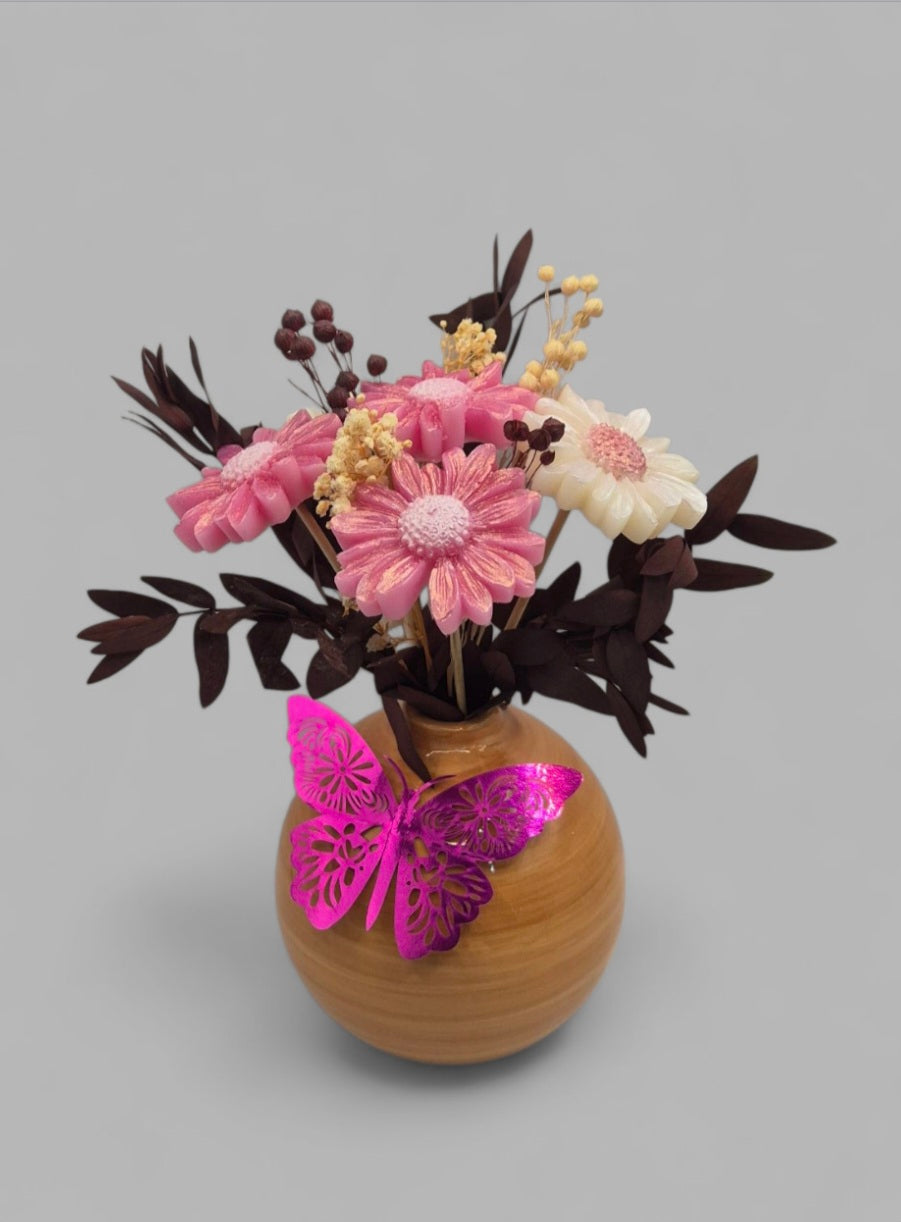 Un bouquet de fleurs éternelles en cire végétale, fleurs séchées et artificielles, entièrement fait main et délicatement parfumé aux senteurs envoûtantes de Grasse. Un objet déco unique qui diffuse subtilement son parfum durant de long mois tout en embellissant votre intérieur.